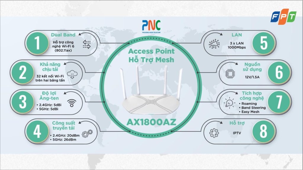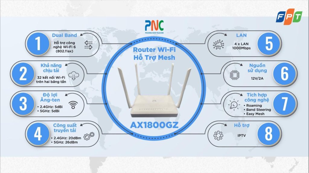 - Trang bị Modem băng tầng kép 2.4 – 5.0Ghz công Nghệ Wi-Fi 6
