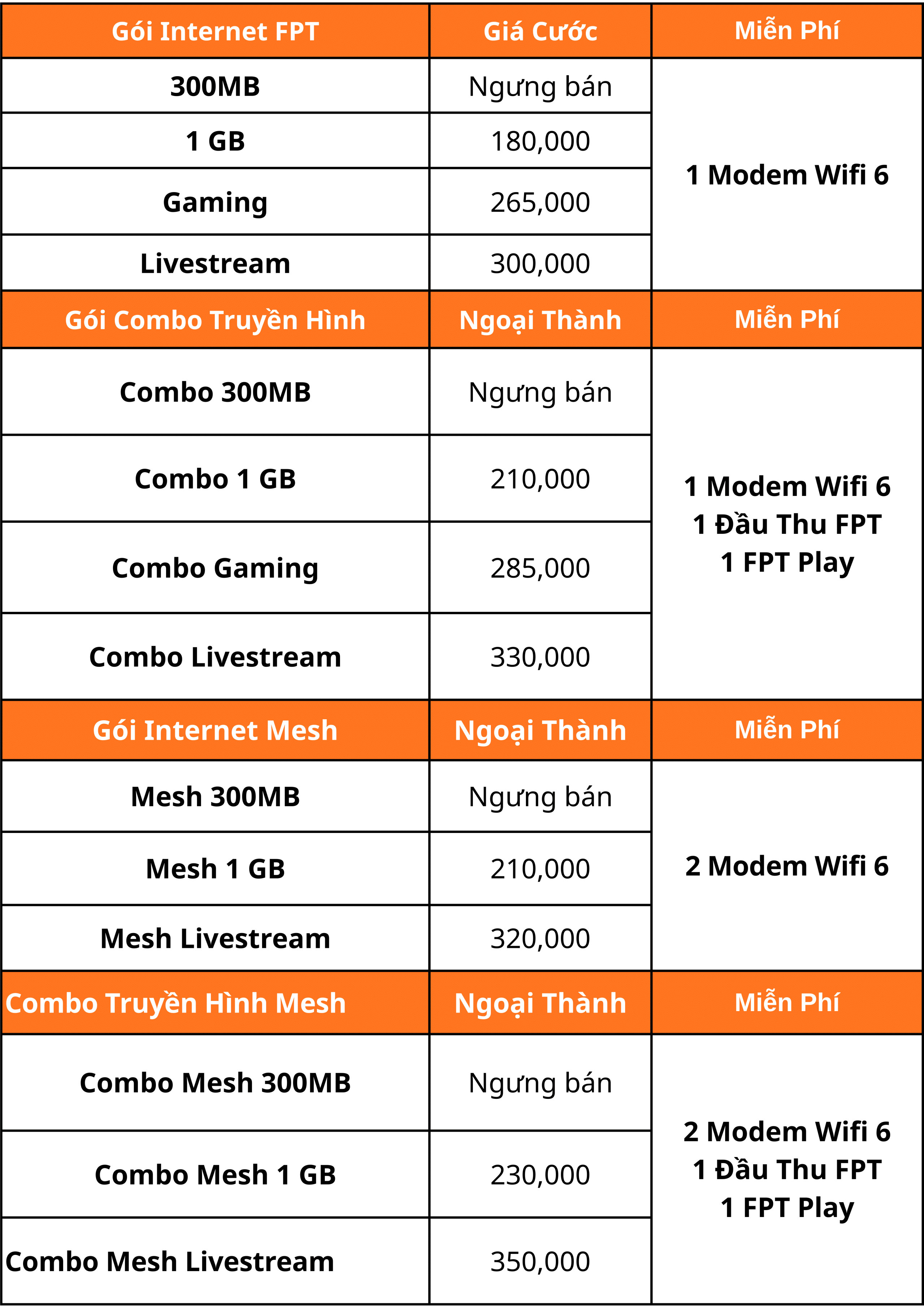 • Combo Internet + FPT Play (VVIP/Thể thao): Giá từ 299K/tháng tùy tốc độ đường truyền (Sky, Meta).